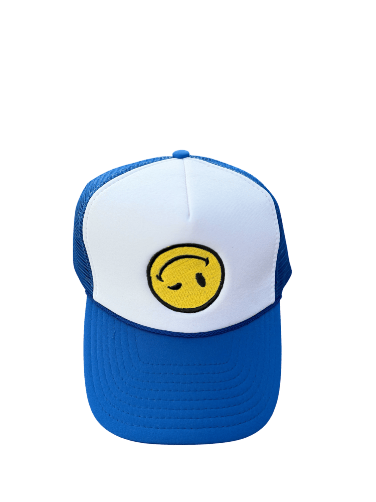 White and blue big face trucker